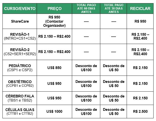 O valor para a reciclagem dos cursos extracurriculares fica estipulado como na tabela abaixo, exceto para o curso ShareCare e os eventos Revisão-1 e Revisão-2, que não oferecem descontos para reciclagem.